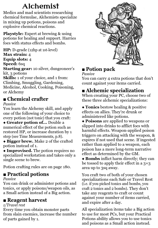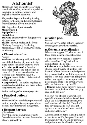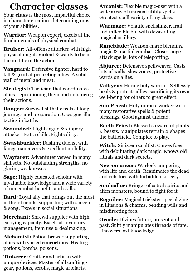 - A wide variety of flavorful and focused character classes designed to capture specific, compelling fantasies and feel wildly distinct from each other, with the majority of classes being non-magical - scholars, rangers, merchants, bards and more can contribute effectively without the use of magic.